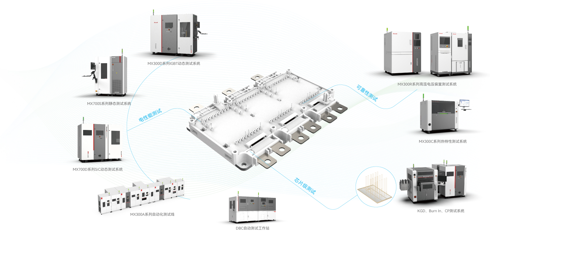 MX300A系列自动化测试产线由上料机、绝缘测试、预热、高温静态测试、高温动态测试、冷却及NG下料、常温动态测试、常温静态测试、拱度、全尺寸、NG下料、下料机等模块组成,采用公司自主研发的测试系统与自动化相结合,为IGBT自动化产线测试提供一个精准、稳定的测试平台,用于产线全方面检验IGBT的参数特性。