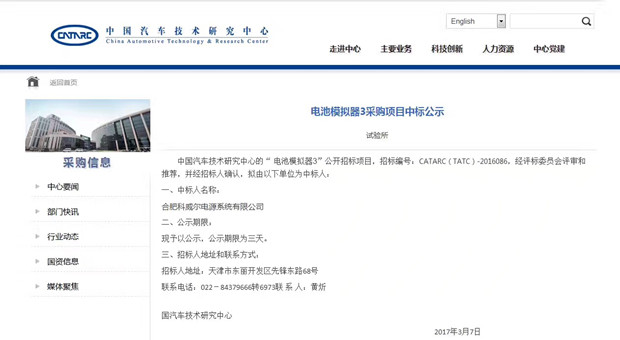中国汽车技术研究中心2017年3月7日公告,合肥678体育电源系统有限公司中标中国汽车技术研究中心“电池模拟器2”(招标编号:CATARC(TATC)-2015085)、“电池模拟器3”(招标标号:CATARC(TATC)-2015086)项目。